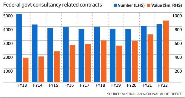 Meanwhile, the value of consulting contracts to Canberra more than doubled over the last nine years from $352 million to $888 million in 2021–22, according to the national audit office.